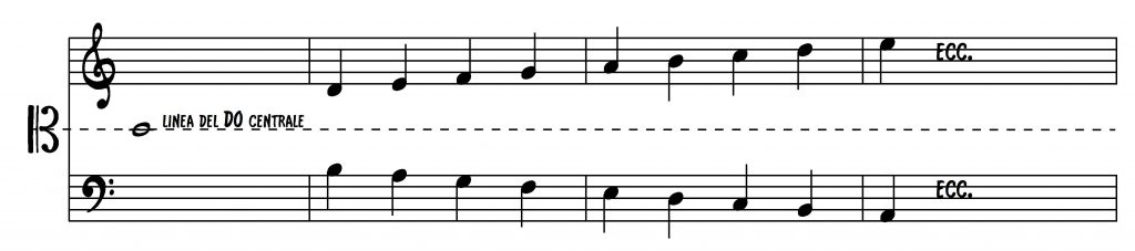 Abbiamo già visto che il do centrale lo troviamo scritto sia in chiave di Sol, sia in Chiave di Fa: è scritto sempre fuori dal pentagramma, attraversato da un taglio addizionale, ma in Chiave di Sol è sotto il pentagramma, in Chiave di Fa è sopra. Quando abbiamo il doppio pentagramma si può anche trovare in posizione centrale tra i due pentagrammi.